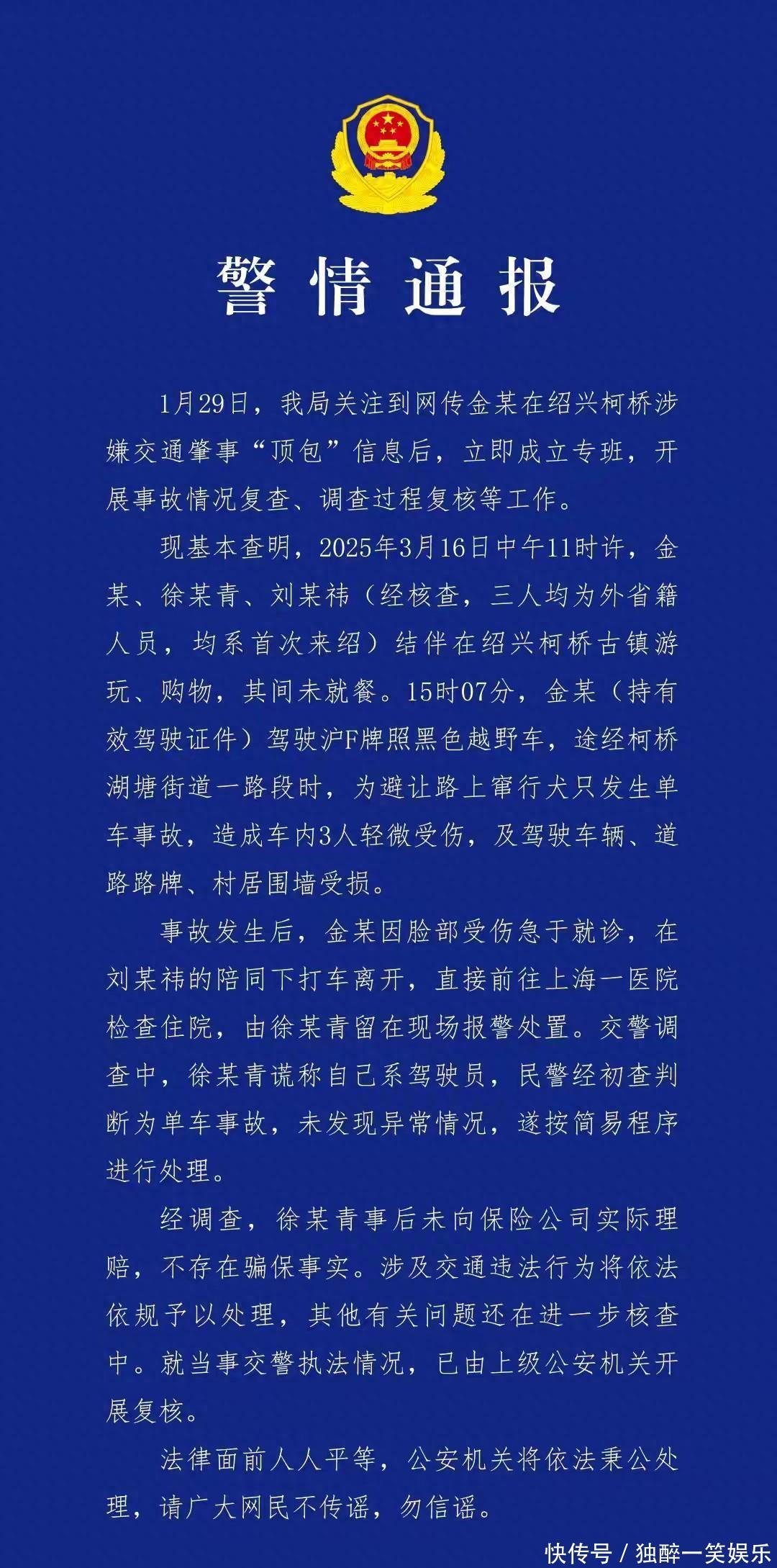 序章:春晚刚唱完《她们在场》,她却在去年的车祸现场“不在场”2026年马年春晚的余温还没散尽,刚和秦岚、辛芷蕾在舞台上岁月静好合唱《她们在场》的金晨,转头就被锤了“去年不在场”——#曝金晨肇事逃逸# #金晨助理顶包# 两个热搜像窜天猴似的炸上榜首,讨论量一夜破亿,网友戏称“春晚舞台有多光鲜,车祸现场就有多狼狈”。谁能想到,这位在赛车综艺里顶着40度高温练漂移、嘴硬“我不比男的差”的“女车神”,现实中撞了墙跑得比博尔特还快,留下受伤助理在原地“扛雷”,上演了一出娱乐圈年度荒诞剧。一、事件经过:一场被保险公司“抓包”的跨年顶包案要追溯这场大戏的源头,得把时间拨回2025年3月16日,一个平平无奇的下午,浙江绍兴柯桥区湖塘街道的村民们,意外成为了顶流明星塌房现场的“野生观众”。当天下午3点多,一声巨响打破了村庄的宁静——金晨驾驶着自己的沪牌越野车,不知道是被综艺里的“漂移人设”冲昏了头,还是真如她后来所说“为了避让窜出来的小狗”,车子突然失控,先撞断路边的警示牌,接着狠狠撞上民房围墙,场面堪比低成本动作片:车子前脸撞得稀碎,车窗全裂,围墙塌了一大片,后排的助理徐长青更是被撞得轻微擦伤,脸上手上都是血。按说正常人遇到这种事,第一反应是停车、看伤员、报警、联系保险公司,四步走流程比打卡上班还熟练。但金晨偏不,她用实际行动诠释了“明星的脑回路你别猜”——她和经纪人第一时间脚底抹油溜了,只留下受伤的助理在现场“负重前行”,甚至还贴心地安排助理谎称自己是驾驶人,替她签了事故认定书。这操作让围观村民都看傻了:“见过肇事逃逸的,没见过把伤员留下顶包的,这明星也太‘仗义’了!”本以为这事儿就这么被蒙混过关了,毕竟事故不算重大,加上助理顶包,交警按简易程序结了案。可千算万算,没算过保险公司的“火眼金睛”——工作人员在理赔核查时调取监控,发现当天开车的根本不是助理,而是早就溜之大吉的金晨本人!这波“狸猫换太子”直接被保险公司识破,反手就报了警。眼看要露馅,金晨方面赶紧服软,主动提出撤销理赔,全额承担所有损失,这才让保险公司撤了案,试图把这事儿压下去。谁曾想,纸终究包不住火。2026年1月,刚上完春晚的金晨正处于事业上升期,这起被藏了快一年的车祸,因为一场“公关费谈判破裂”彻底引爆。据圈内知情人士透露,狗仔早在1月18日就预告“90后属马女星塌房”,随后金晨团队与爆料方开启谈判,想花钱买断证据,结果双方在金额上谈崩,金晨团队还态度傲慢地发律师函威胁,彻底激怒了爆料方。1月29日,狗仔直接全网公开《道路交通事故认定书》、监控疑点等关键证据,这场“跨年顶包案”才算正式浮出水面。