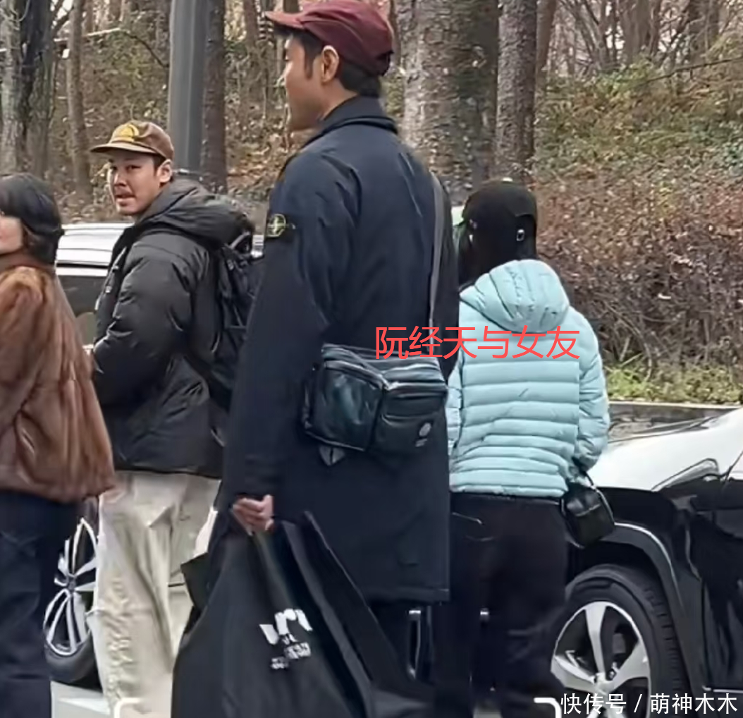 从偶遇图能看出来,阮经天当天穿的是黑色中长款羽绒服,戴了红色帽子。在一张同框偶遇图中,他也是一样的打扮,旁边跟随了一个穿蓝色羽绒服的女生,两人肢体距离很近。而在他们前方的一男一女则是阮经天的弟弟和弟妹。