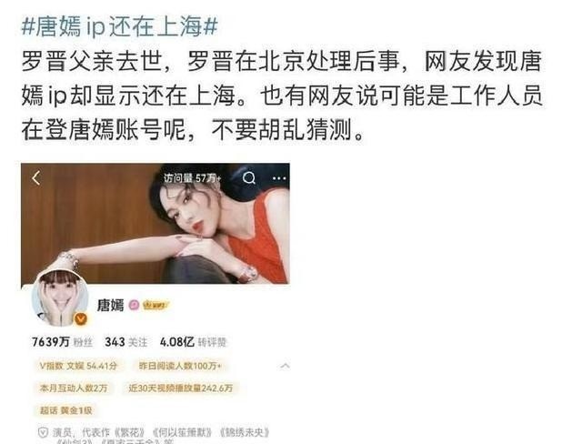 罗晋父亲去世,对整个家庭都是沉重打击。网传信息里,有人根据唐嫣社交账号显示的IP城市,推演她是否在第一时间赶到老家,进而再度指向不合分居。