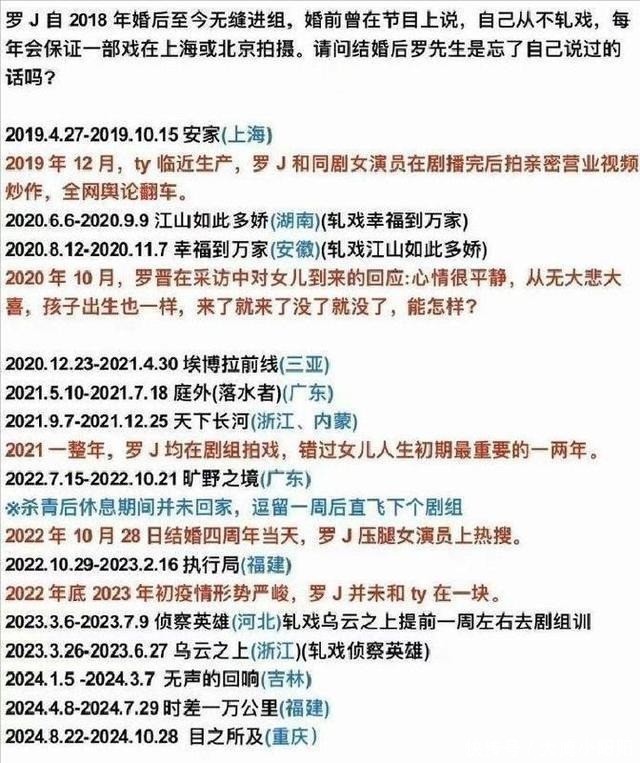 有博主整理了罗晋近几年拍戏、活动的时间表,标注出他在剧组、在老家、在各地路演的节点,再拿来和唐嫣公开行程对照,看两个人在同一个城市出现的次数,得出的结论是——同框变少了。
